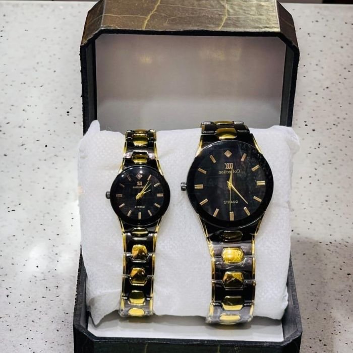 Elevate your style and share timeless moments with this Stylish Couple Watch Set. Designed for modern couples, this set includes 2 pieces of quartz analogue watches featuring a sleek chain strap and a rounded dial that exudes sophistication. The golden and black color options add a touch of vibrancy, making these watches perfect for any occasion.